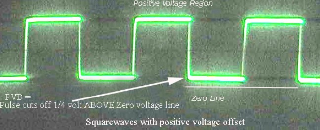 The 15 HZ square-waves with positive voltage offset seen on the oscilloscope, is an exclusive feature with every MST built. It is called PVB, or Positive Voltage Bias. The use of PVB guarantees that all of the zapper's pulsing current will kill pathogens, and not allow even a momentary negative current flow at the zero line border region, because a negative current would invigorate pathogens rather than kill them.