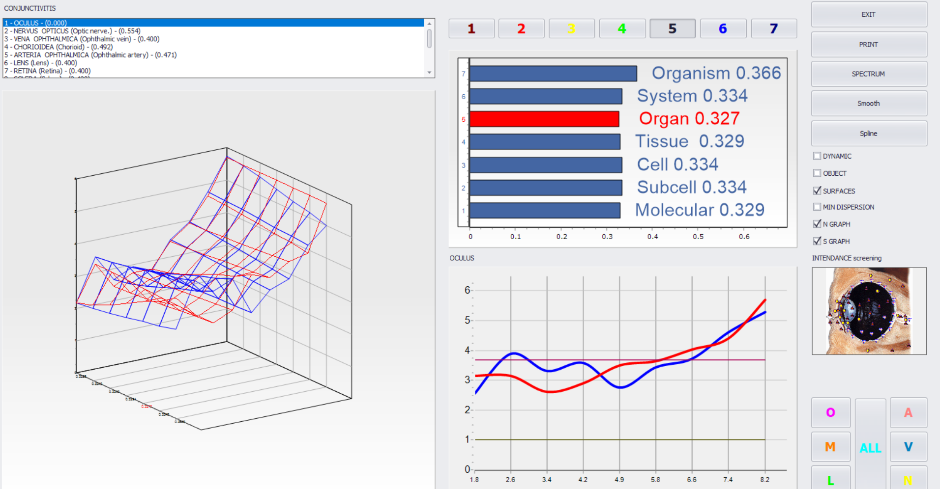 Every organ and every cell has its own distinctive oscillation signature which are digitally stored in the computer memory and can be displayed on a screen as a graph, which represents the conditions of the information exchange between the organ (tissue) and the environment. Every pathological process has its own distinctive 3D graph.