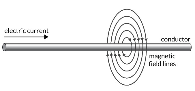 Magnetic fields ultimately are the result of the motion of charges. A typical representation of this can be seen in the figure below. We can see the magnetic field surrounding the straight wire as current is moving through it. We use this phenomenon to store information in computers. The magnetic field around a current-carrying wire can be increased by coiling the wire or increasing the current running through it.