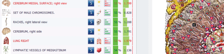 These computer models give physicians a 3D projection of internal organs. Colored marks placed upon the picture make it easier for the therapist to determine the sites of pathological processes. It is possible to judge the process of disintegration of these biological structures, and make a prognosis, by comparing the range of colors of the marks and their arrangement on the computer model of the organ, using the dynamics of their change over a period of time.