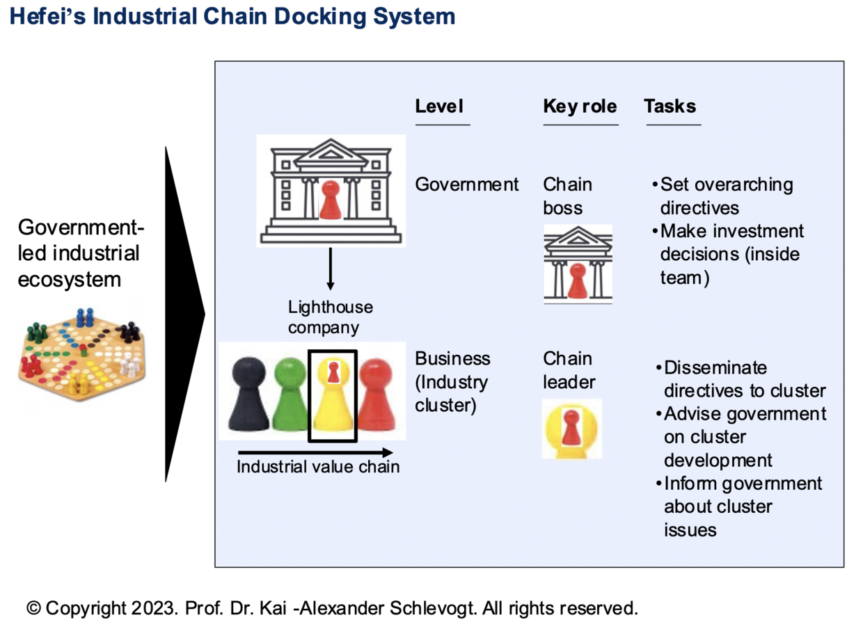 Based on the interactively developed smart strategic blueprints, the city government in Hefei, aided by "investment consultants" from industry (who, among other things, advise the government and perform due diligence), assumes the role of a venture capitalist and strategic equity investor.