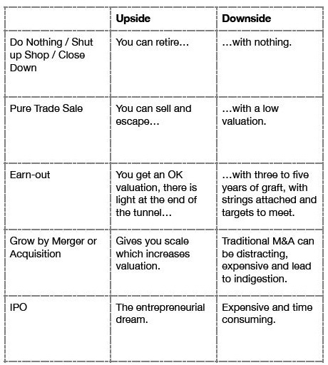 A genuine alternative to exiting is to grow by acquisition. Thus, you could try and raise money, and add some real value. But because of the challenges around scale and liquidity, any cash investor wants a belt and braces approach to the deal, to be absolutely sure to get their money back.