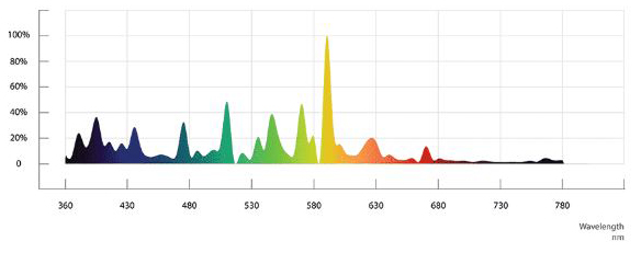 Depending on the source, broad spectrum white light comes in many forms. Human eyes perceive these different spectra as cooler (blue) or warmer (orange/red), depending if it is a metal halide or high-pressure sodium lamp, or what type of phosphor coating is used with LEDs and fluorescent bulbs.