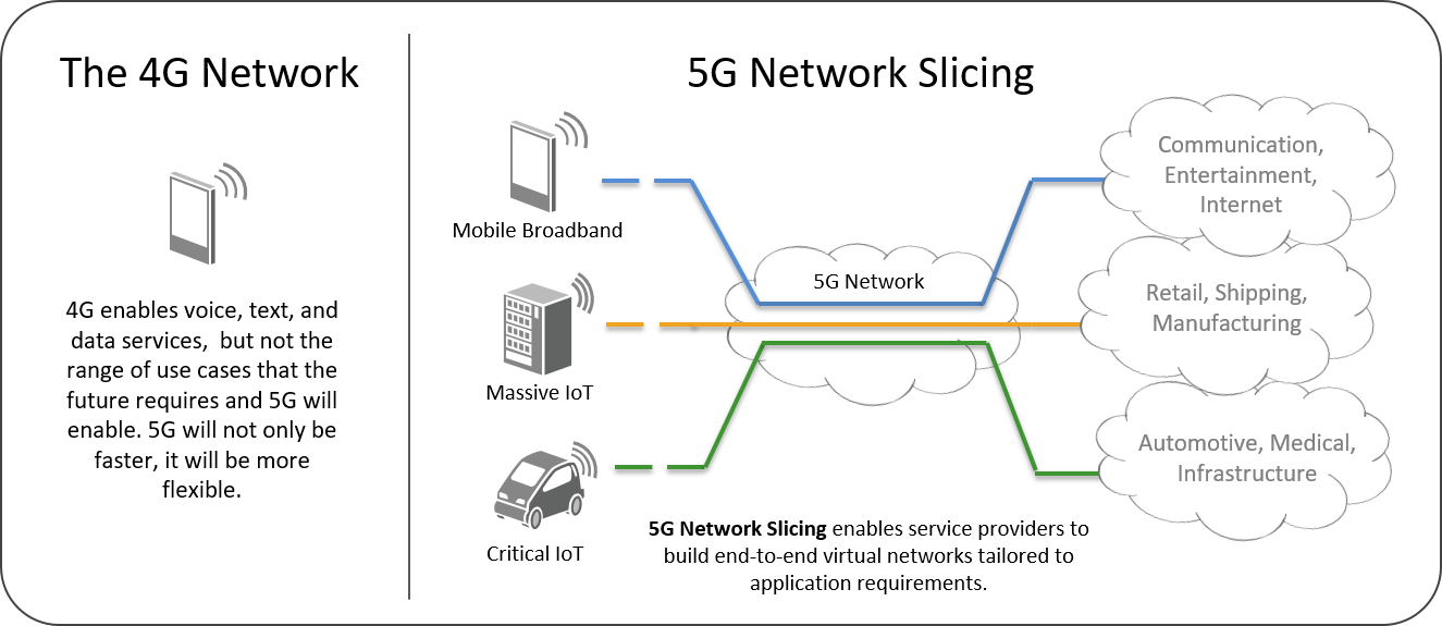 With 5G, a single physical core network will be sliced into multiple virtual networks that can support different service types running across a single RAN (Radio Access Network).