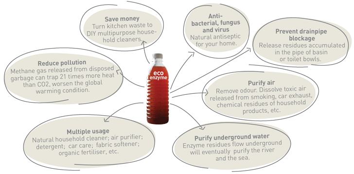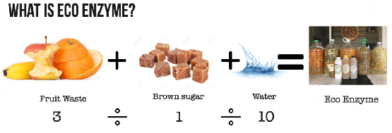 Eco-enzyme (EE) is a complex solution produced by fermentation of fresh kitchen fruit and vegetable dregs, brown or molasses sugar and water. It is brown and has a strong sweet sour fermented scent. EE is a multipurpose liquid, used in household, agriculture, animal husbandry, etc.