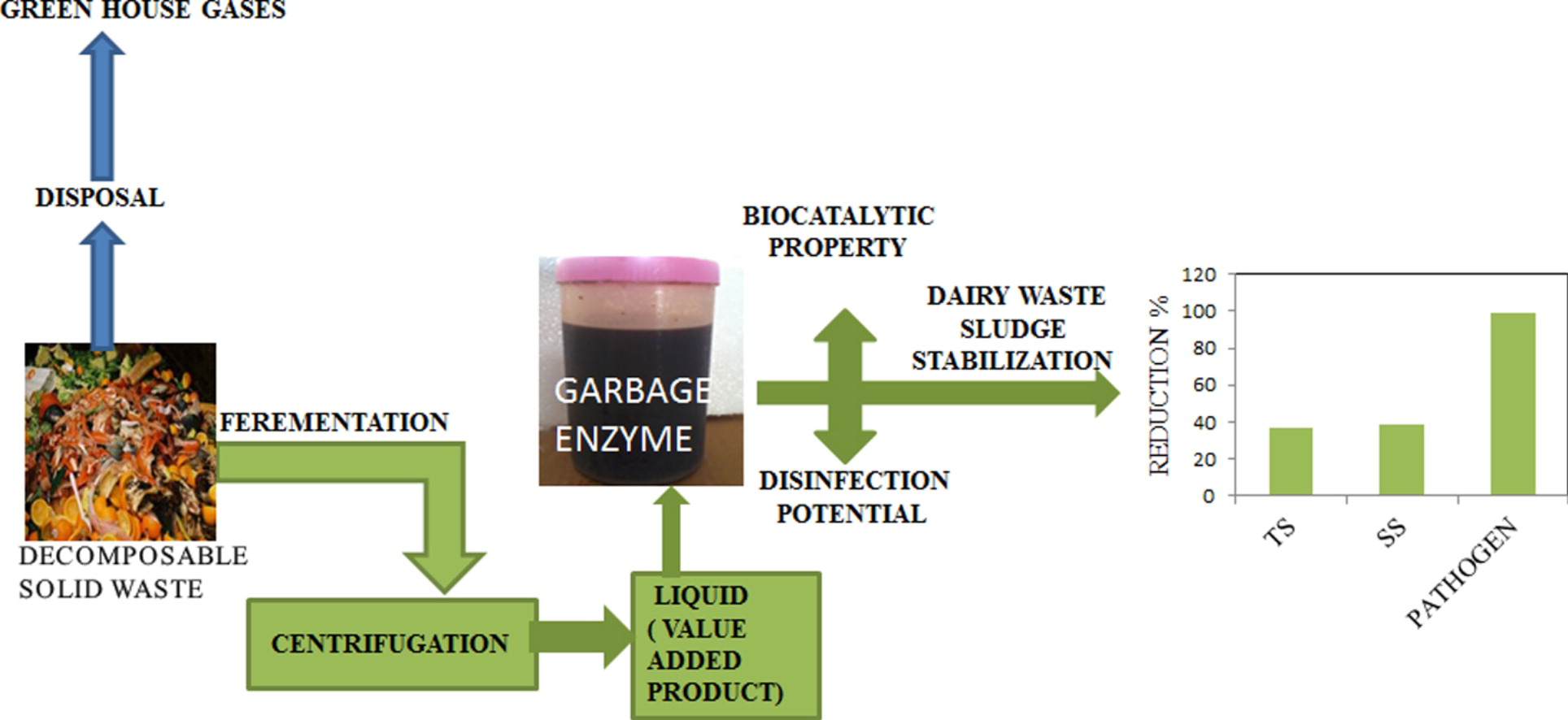 Decomposable waste thrown into the environment can be used to produce value added bio-products, which reduces the production of greenhouse gas. Garbage enzyme (GE) is one!