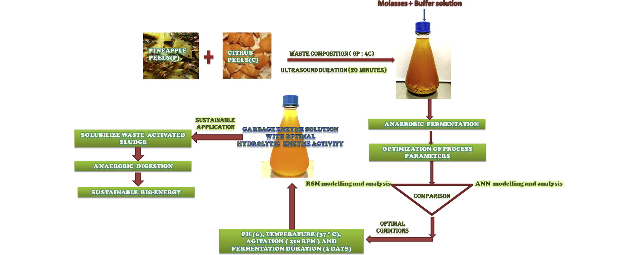 GE produced from 6 g pineapple peels + 4 g citrus peels were pre-treated with ultrasound for 20 min. It showed higher hydrolytic enzymes activity. Simultaneously statistical optimization tools were used to model GE production with higher activity of amylase, lipase and protease, predicted to be 56.409, 44.039, 74.990 U/ml respectively at optimal conditions of (pH (6), temperature (37 °C), agitation (218 RPM) and fermentation duration (3 days). These optimized conditions can be used successfully for large scale production of Garbage Enzymewith higher hydrolytic enzyme activity: